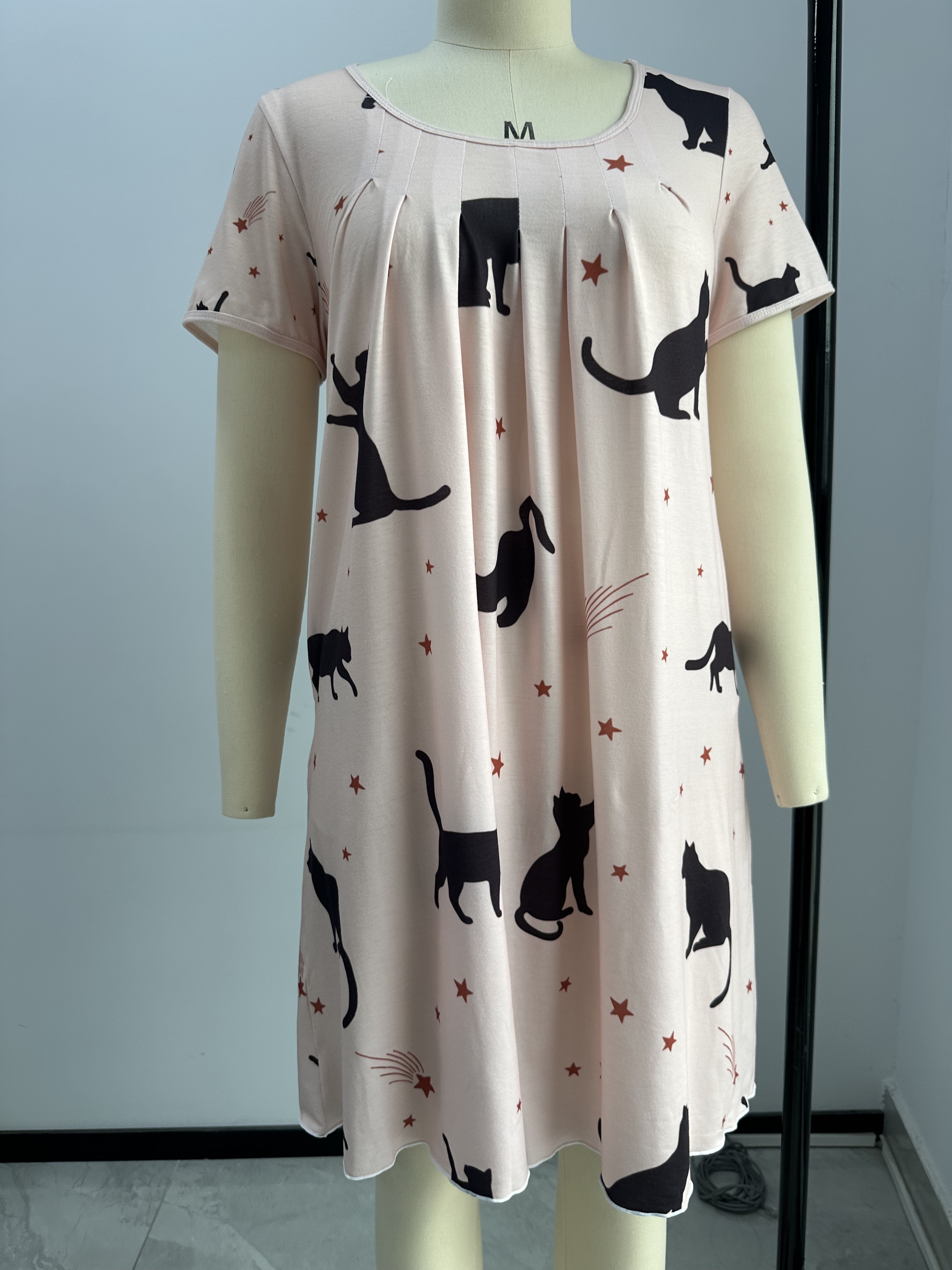 【Accessory Structure】Nightdress featuring front pleats detail, short sleeve sleepshirt, round neck.