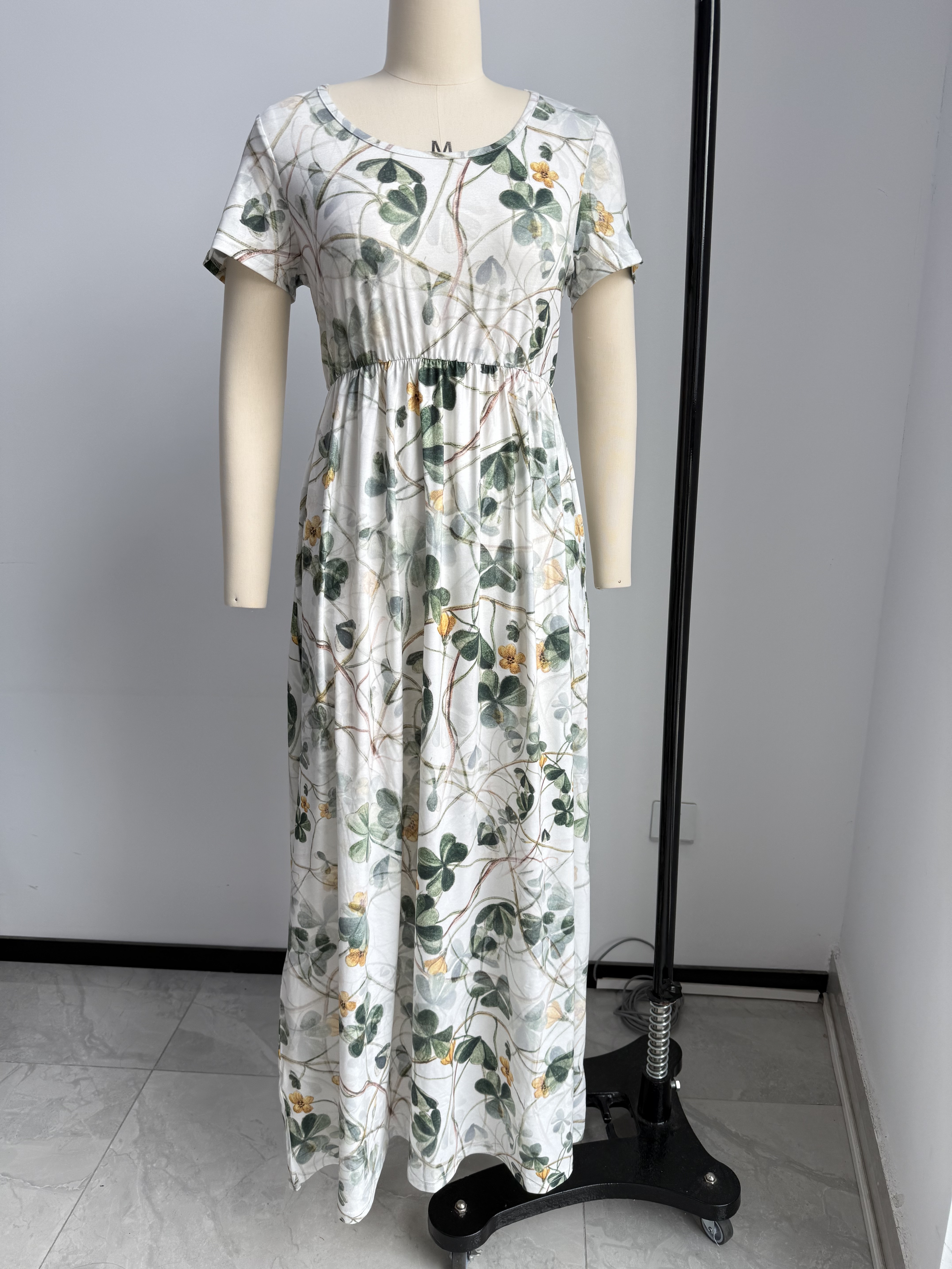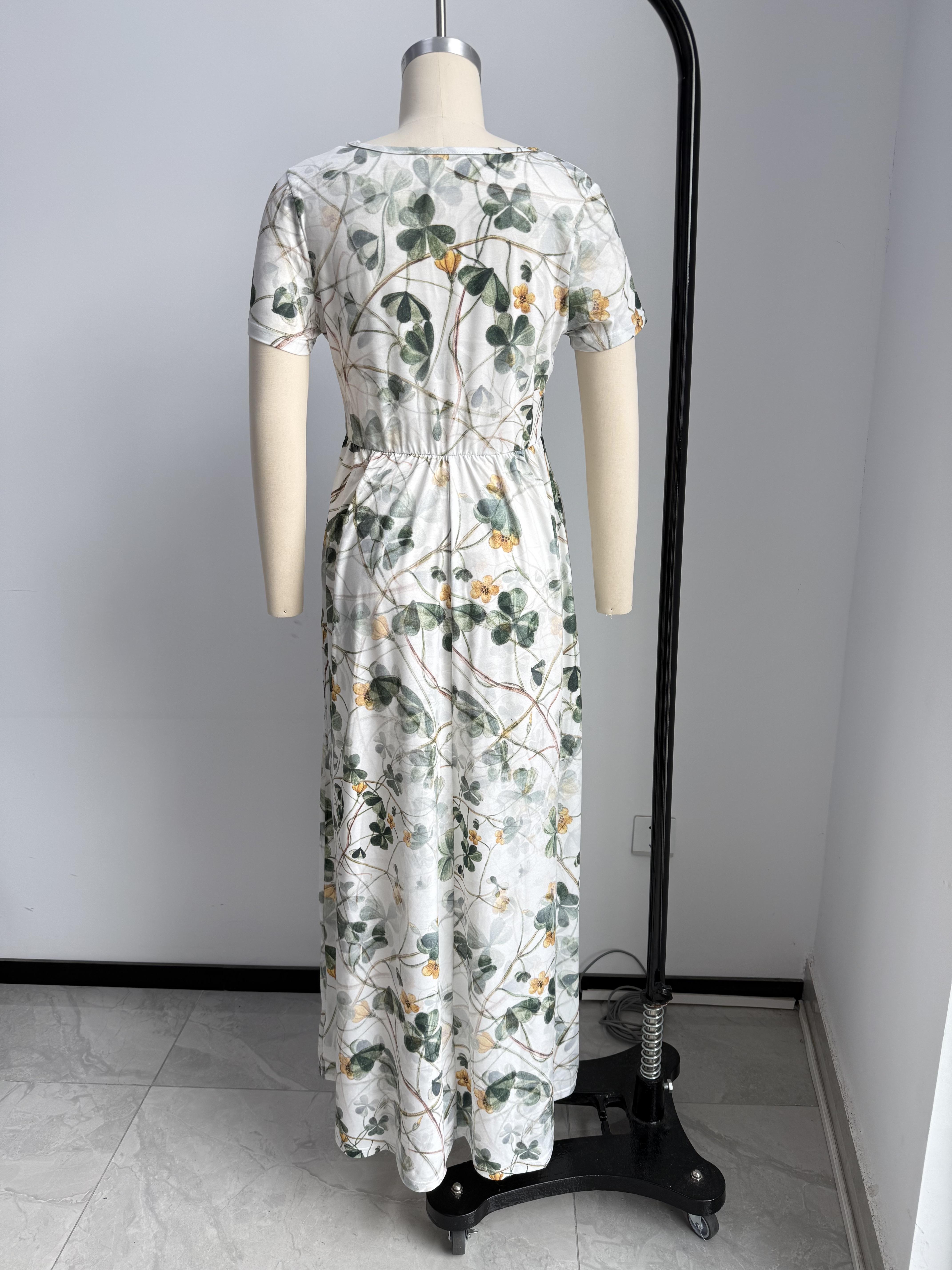 【Accessory Structure】Short Sleeve;Round Neck;Side Pockets;Elastic Waist;Pleated;Maxi Dress.