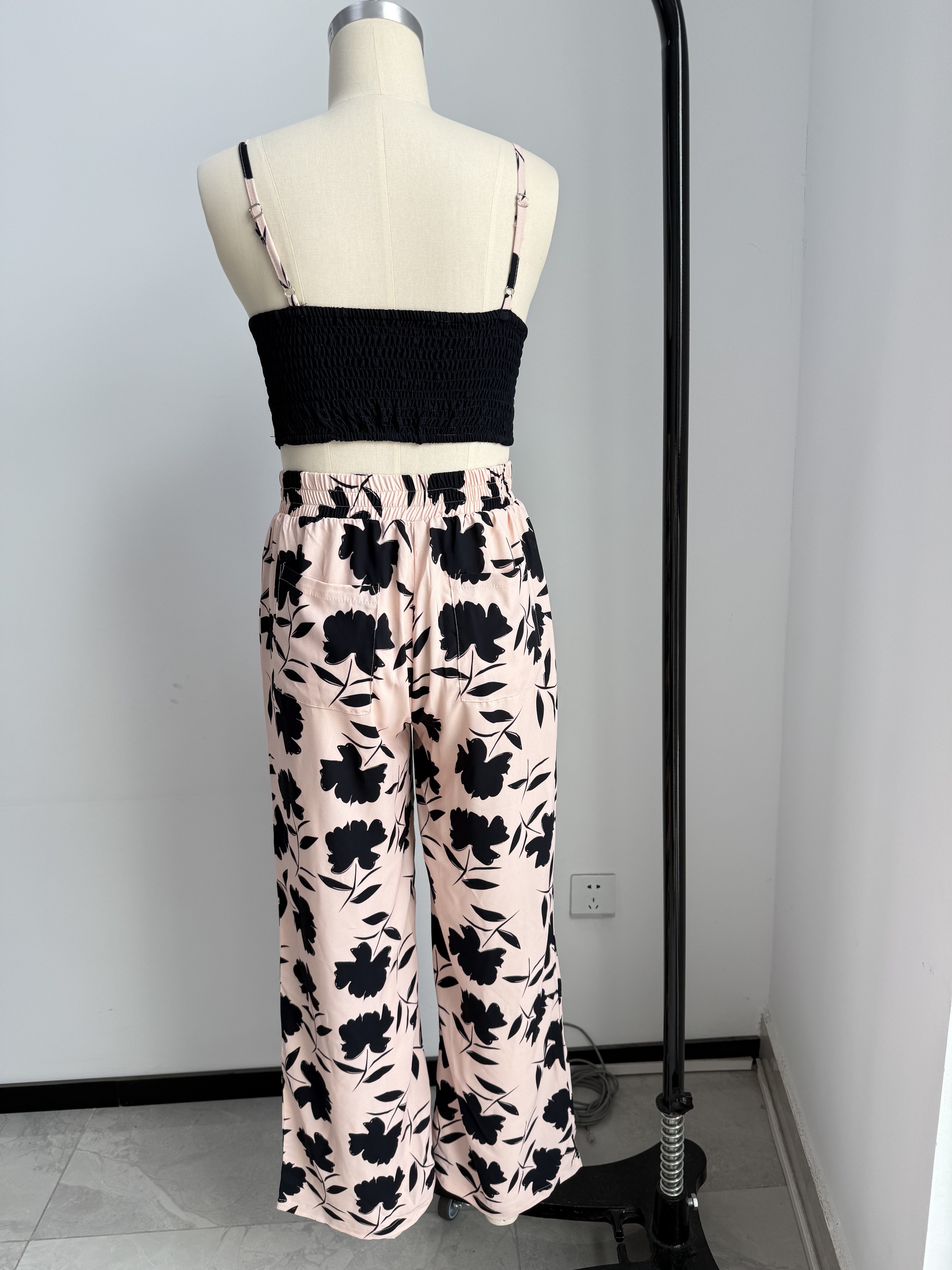 【Accessory Structure】Casual Two-piece Set;V-neck Shirred Crop Cami Top & Tie Waist Pants Outfits;Women's Clothing.