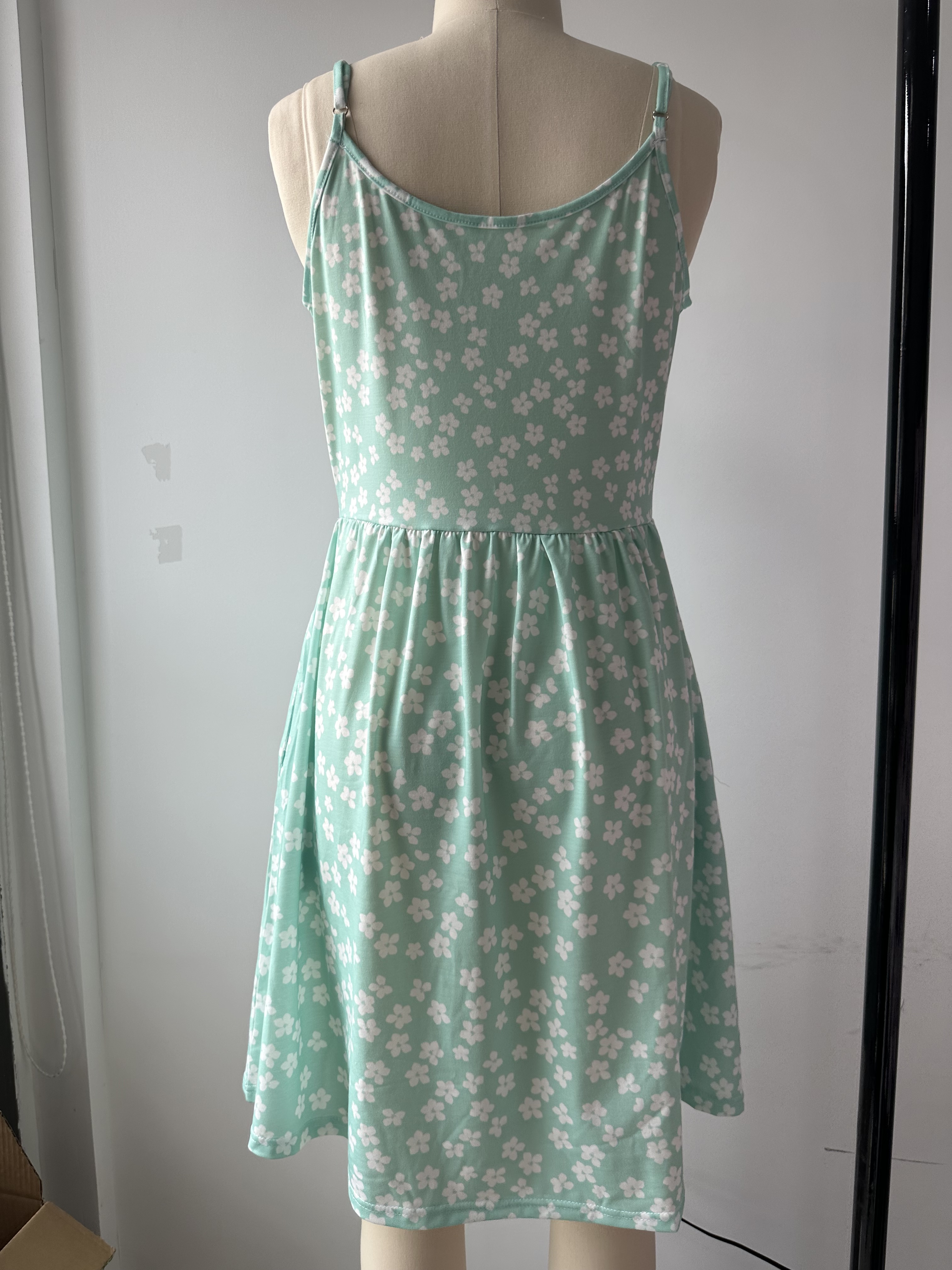 【Accessory Structure】 Spaghetti Straps, sleeveless, two sides pockets, elastic waist, midi length, swing hem a-line.