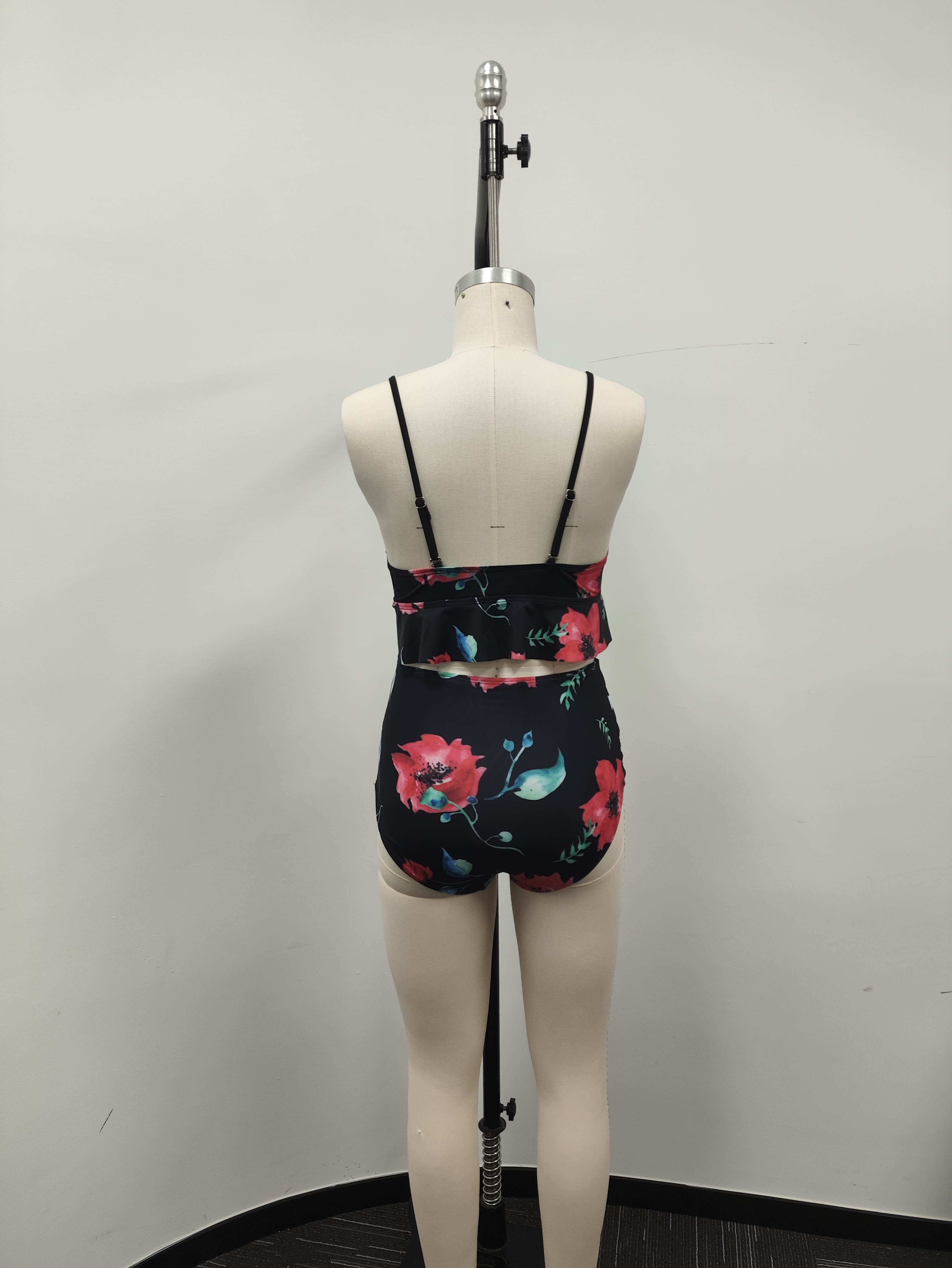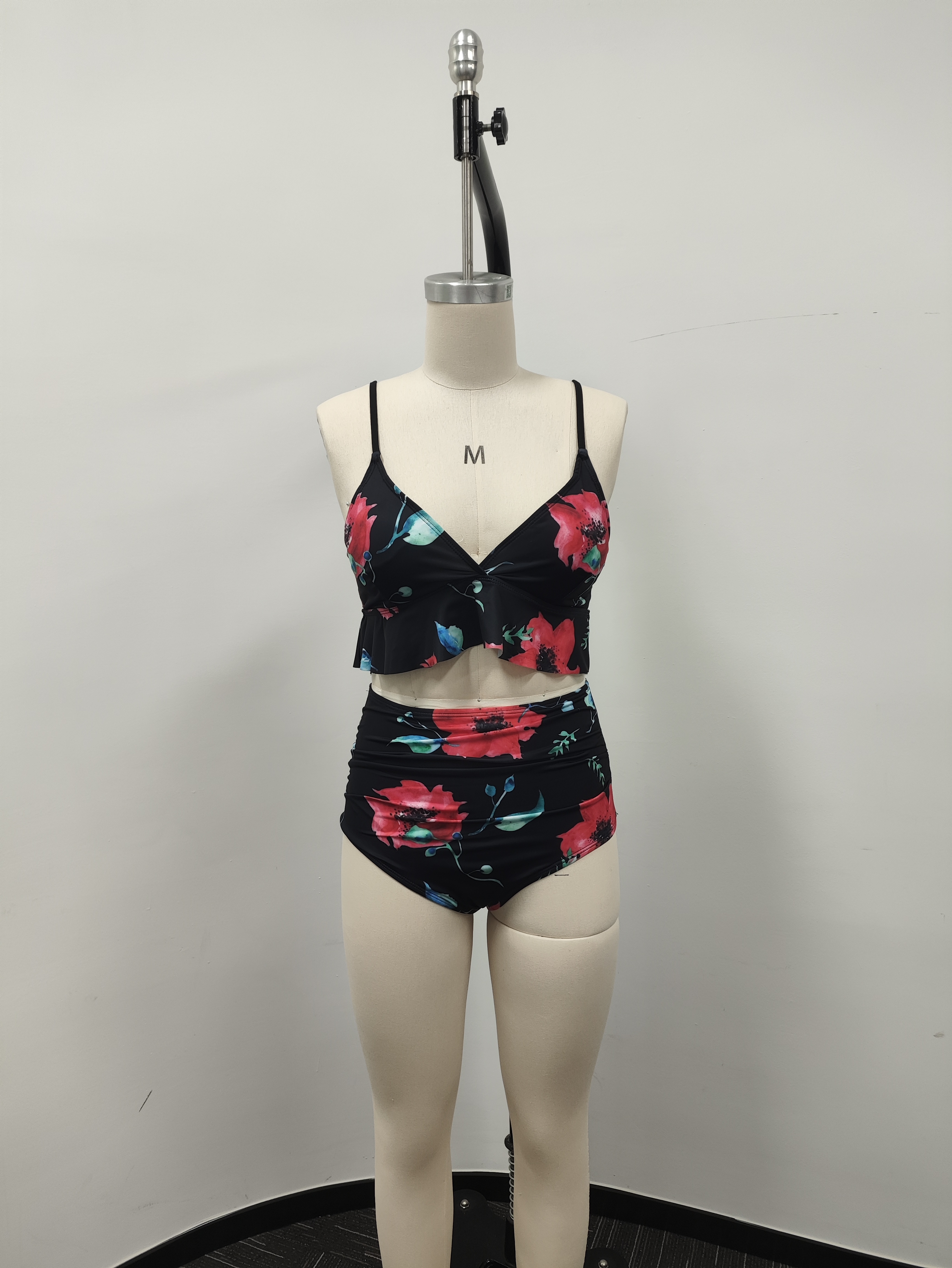 【Accessory Structure】High waist bikini with ruffles and soft chest pads.