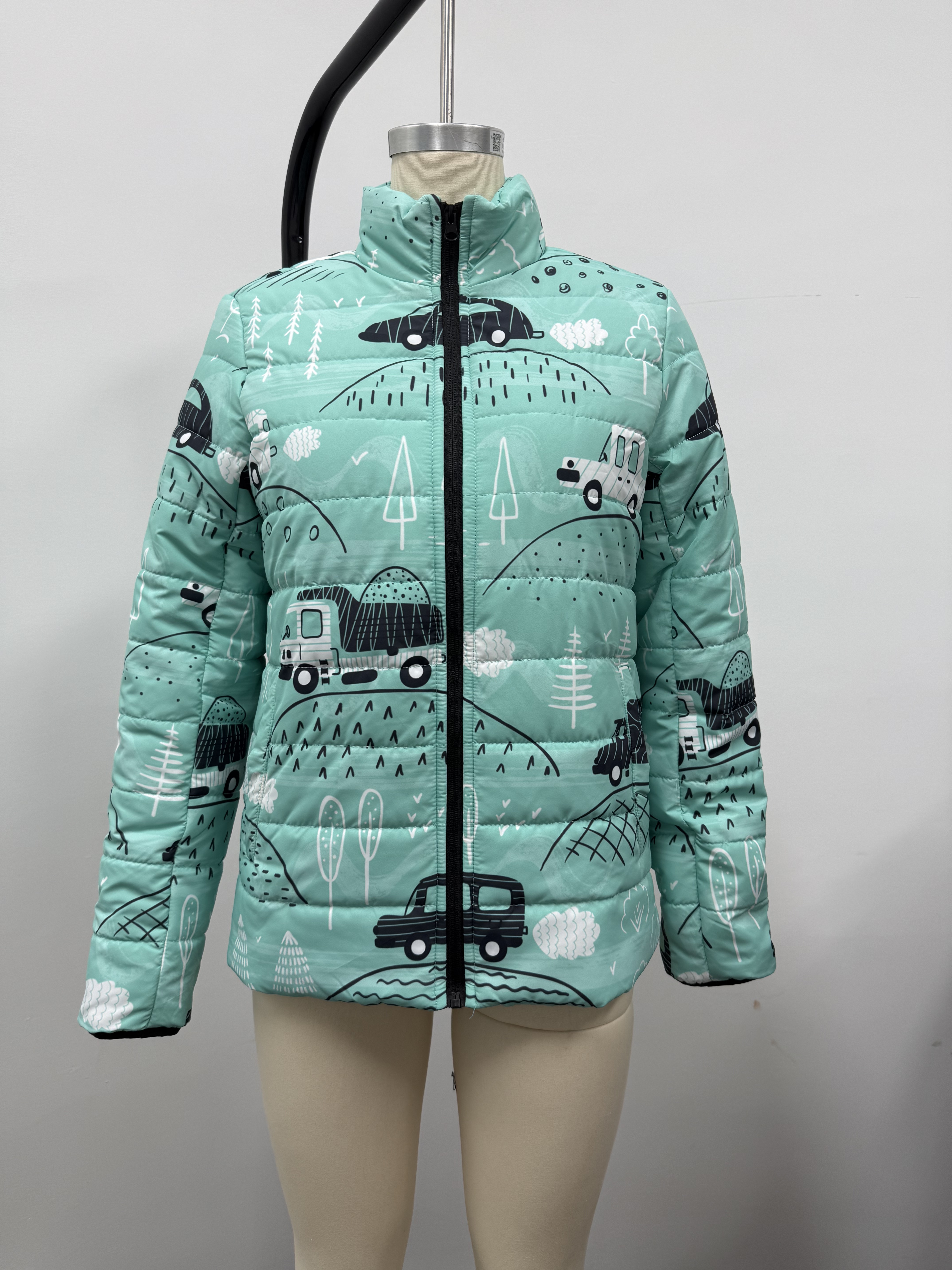 【Accessory Structure】The women’s stand collar padded jacket features a high stand-up collar for added warmth and wind protection. The front is designed with a smooth full-length zipper closure, complemented by reinforced stitching for durability. It includes side pockets for practicality and elasticized cuffs and hem to keep out cold air. The padded interior provides insulation while maintaining a lightweight structure, ensuring both comfort and functionality.